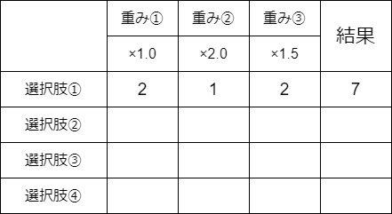 その特性を生かして、選択肢と重みを掛け合わせ、数値として、評価することが出来ます。